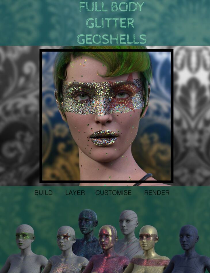 Full Body Glitter Geoshells for Genesis 8.1 Females allows you to build beautiful full-body body glitter for your Genesis 8.1 Female characters.