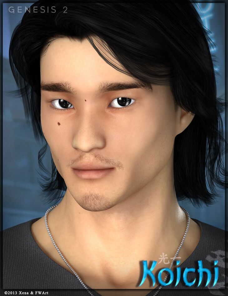 Koichi is a high quality Asian character and accessory set for Genesis 2 Male(s) for use in DAZ Studio 4.6 (or higher) and Poser 9 (or higher).