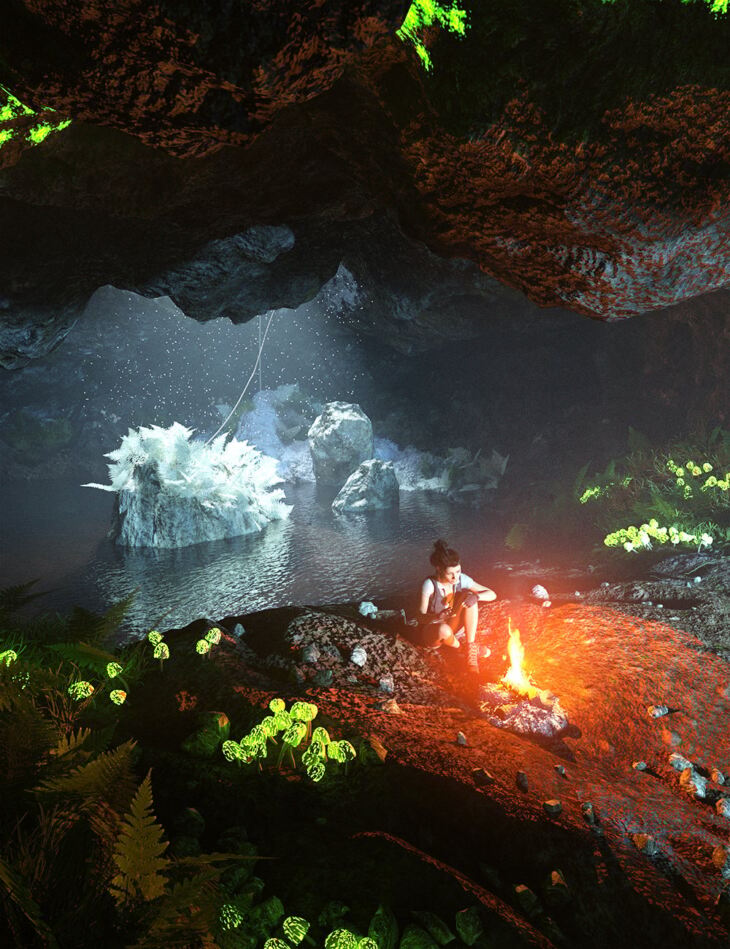 Gangrel's Cave is a detailed modular environment scene that has a removable ceiling and walls. There are various lighting options with mesh lights, spotlights, and pin lights, plus several emissive material zones.