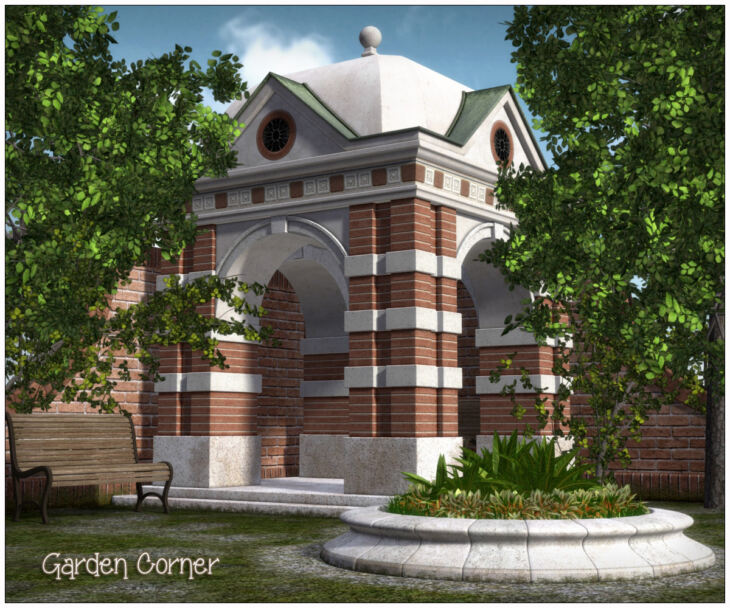 Garden corner scene in calming shades of white stone, red brick and greenery.