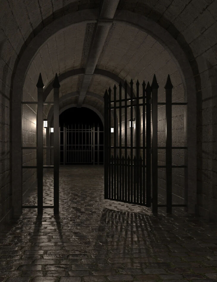 Gated Vignette features a detailed stone and brick tunnel interior with lamps and working gates Optimized for Studio with Iray.