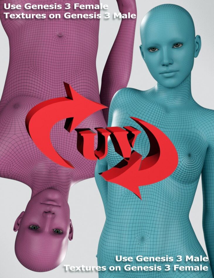 This package contains both UV sets for use on the opposite gender of Genesis 3. Presets are included to apply the UV to your figure after you have applied the desired texture preset.