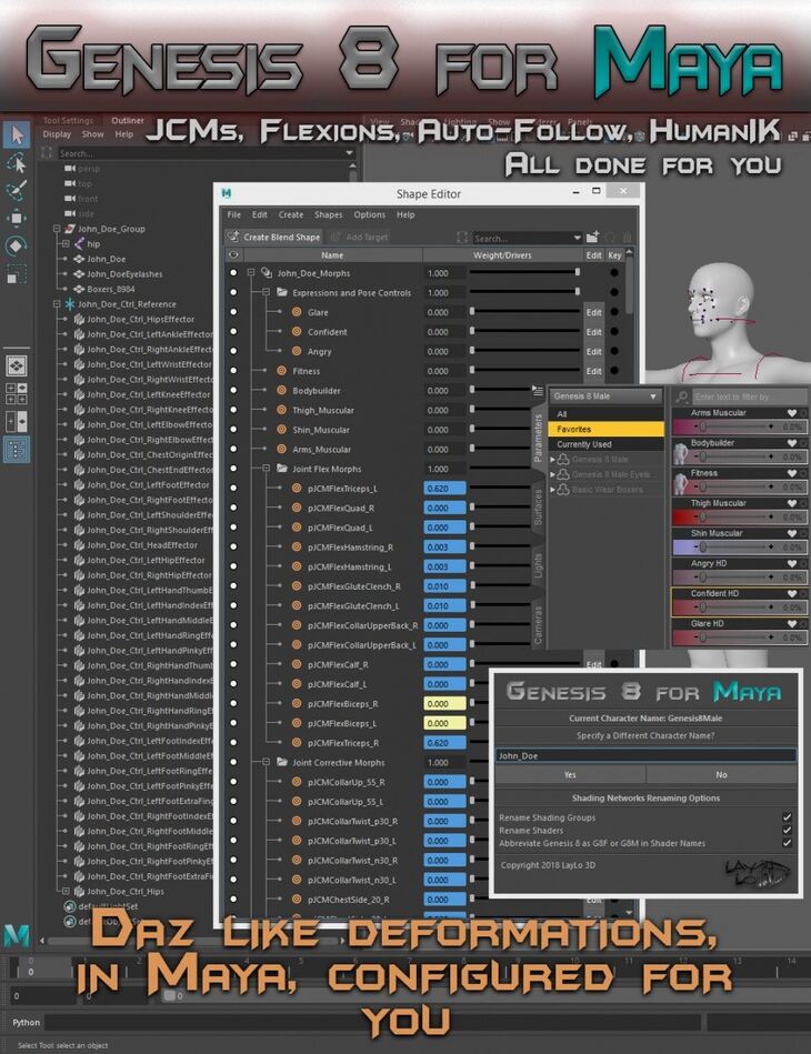 Genesis 8 for Maya is a script and plug-in combination for Daz Studio and Autodesk Maya that exports a Genesis 8 Core Male or Female figure from Daz Studio. Then using the Maya plug-in, imports the figure into a new scene, configures all joint control morphs (JCMs), including both joint corrective morphs and flexion morphs, while setting up HumanIK controls.