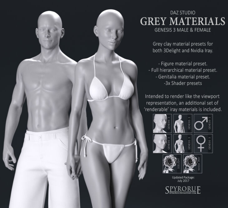This freebie brings back the classic Genesis 1 grey clay material for Genesis 3 Female and Male.