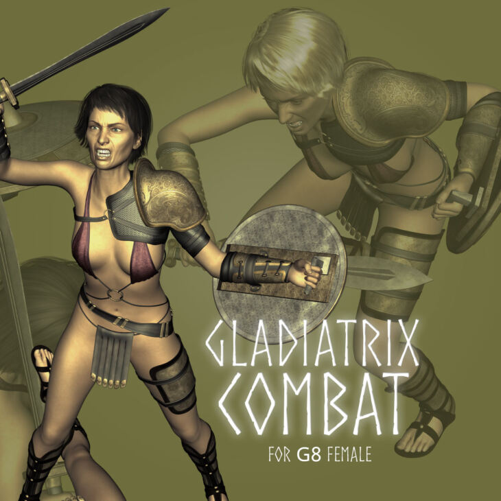 "Gladiatrix Combat" for Genesis 8 Female is a set of 15 wonderful sword and shield combinations that can be explored and adjusted to push your story in any possible direction.
