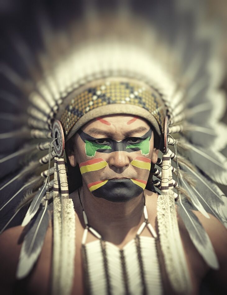 Native American war beauty face paint, symbolizing various elements like strength, bravery, spiritual beliefs, or tribal affiliation. They are bold, symbolic and animal-inspired.