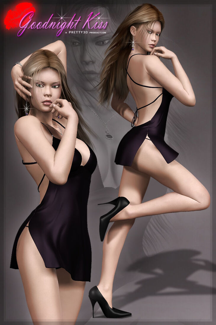 "Goodnight Kiss" is a sexy night dress set which is designed for Victoria 4, Aiko 4, the Girl 4, V4 Elite, Pretty Base IV and Kaileena. This outfit consists of high qualty mesh models with dynamic morphs. These morphs provide to advanced movement morphs to conform realisticially with the character movements.