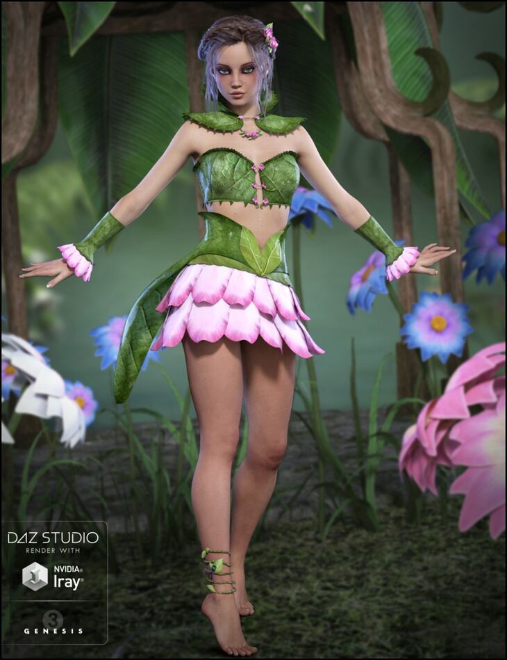 Gossamer is a sweet new fantasy outfit for your Genesis 3 Female(s). Gossamer includes a bra top, petal skirt, leafy coattails, petal wrist cuffs, thorny cape, panty, rose necklace, rose hairpiece, leafy anklet and dragonfly wings.