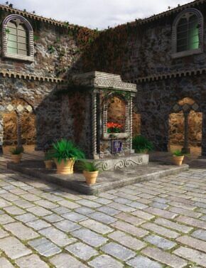 Gothic Courtyard is a Gothic architecture styled courtyard, garden, and cloister featuring high arched corridors, stained glass windows, trees, a garden pool and fountain, and a statue.