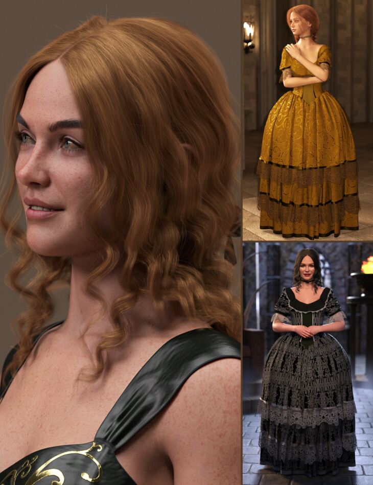 Embrace the power of beautiful and romantic fantasy styles with the dForce Gown of Fantasy 8 and Relaxed Curls Style Hair Bundle for your Genesis 9 figure.