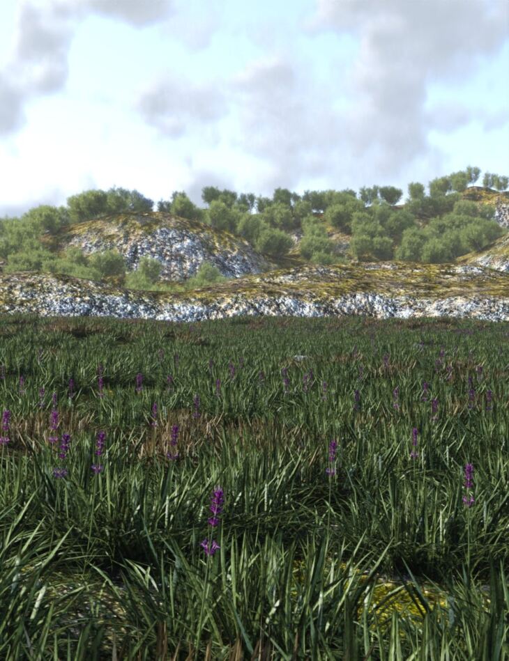 Great Hills is an environment with beautiful hills, and mountains in the background partially covered by clouds.