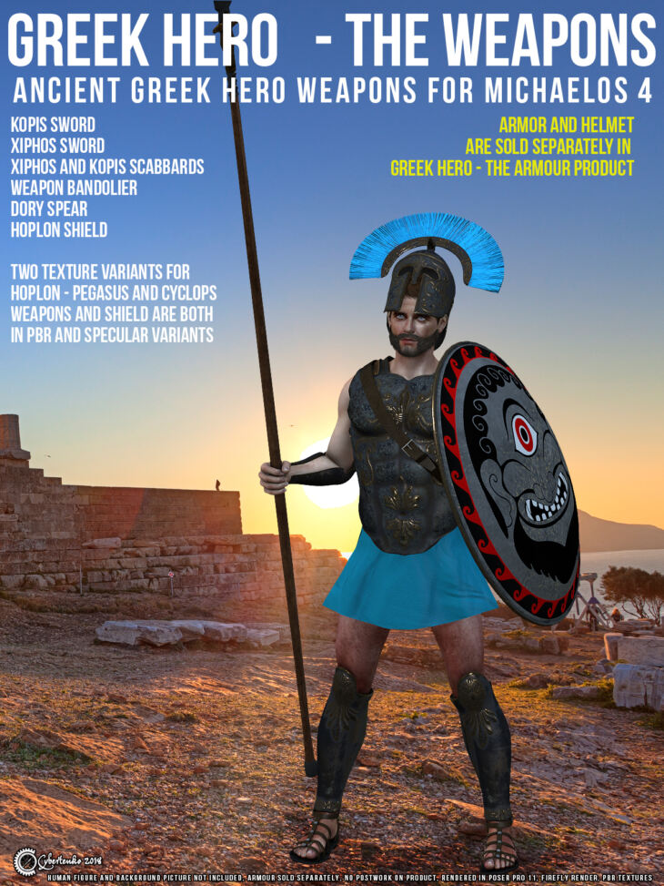 Our model represent typical hoplite weapons - famous one edged sword kopis, two edged sword xiphos, infantry spear dory and large shield hoplon. There are also scabbards for swords and conformer bandolier for scabbards to carry on.
