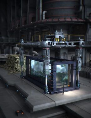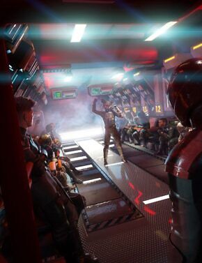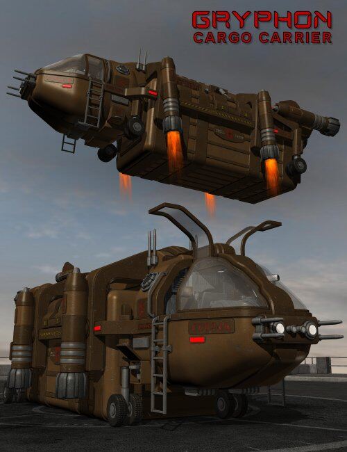 Futuristic cargo carrier vehicle and custom freight container. Highly detailed with multiple moving parts. Also includes thruster flame smart-props and crew station poses for M4 and V4.