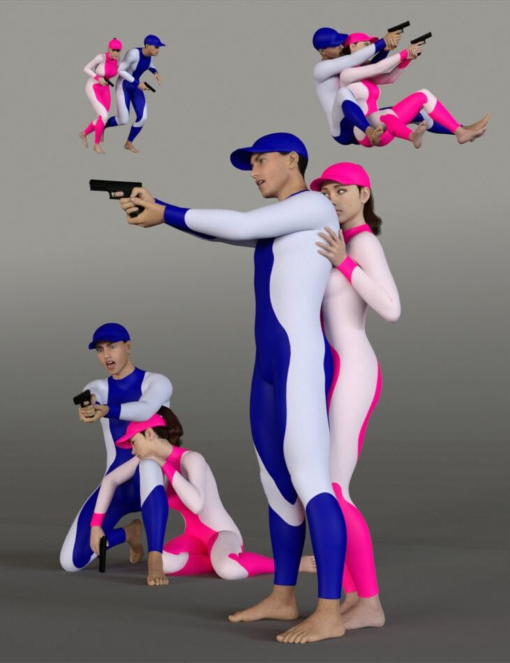 Gun Pose Pairs Volume 1 for Genesis 8 and 8.1 is a set of quality pose pairs of a male and a female figure interacting while firing handguns, for a total of 24 individual full-body poses (12 pose pairs) plus their mirror versions and facial expressions.