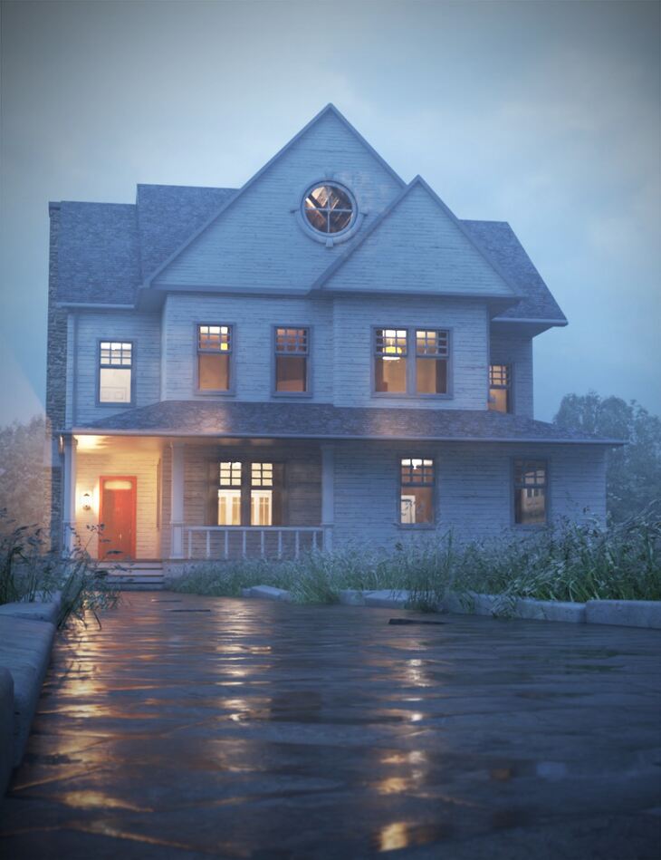 The Harwood House is a large vintage colonial revival/farmhouse crossover with four bedrooms, lots of cupboards, a lounge, dining room, garage, attic and plenty of en-suite/singular bathrooms. The vintage styling complements the set design often used in modern thriller/horror films.