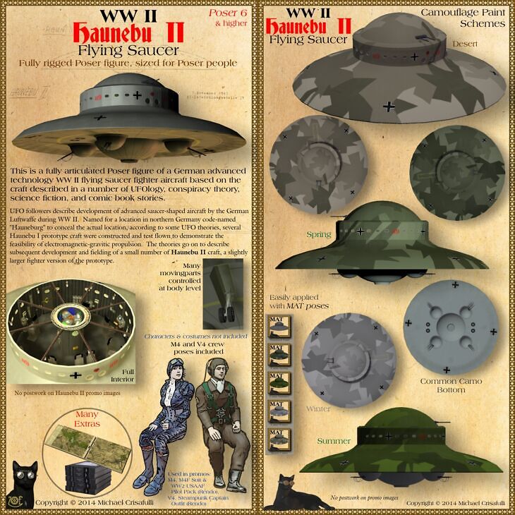 The Haunebu II is a fully articulated Poser figure of an advanced technology German WW II flying saucer fighter aircraft based on the descriptions in a number of UFOlogy, conspiracy theory, science fiction, and comic book stories.