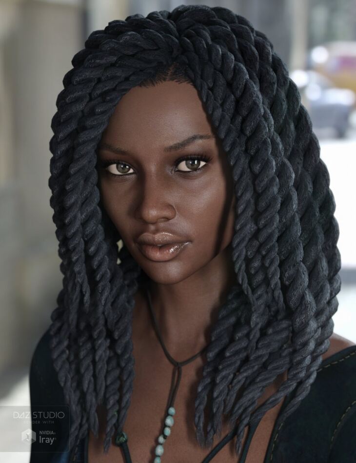 Haven Hair is a morphing, polygonal model of natural afro hair in a twist style. The hair is fitted for Genesis 3 Female(s) (.DUF) with auto-conforming custom morphs for Daz Original characters.