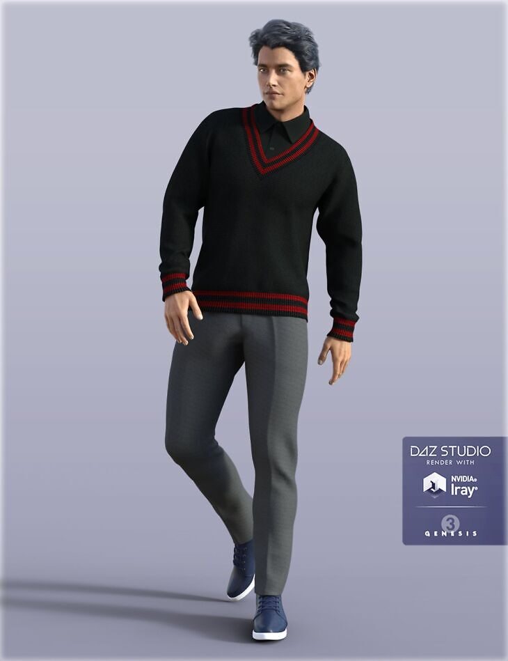 V-Neck Sweater Outfit for Genesis 3 Male(s), with 4 different styles for the Pants, Shoes, and Sweater.