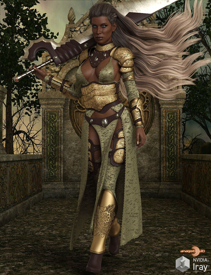 "HEROINE" is a companion texture set for dForce Warrior of Dusk Outfit for Genesis 8 Female(s) by Val3dArt.