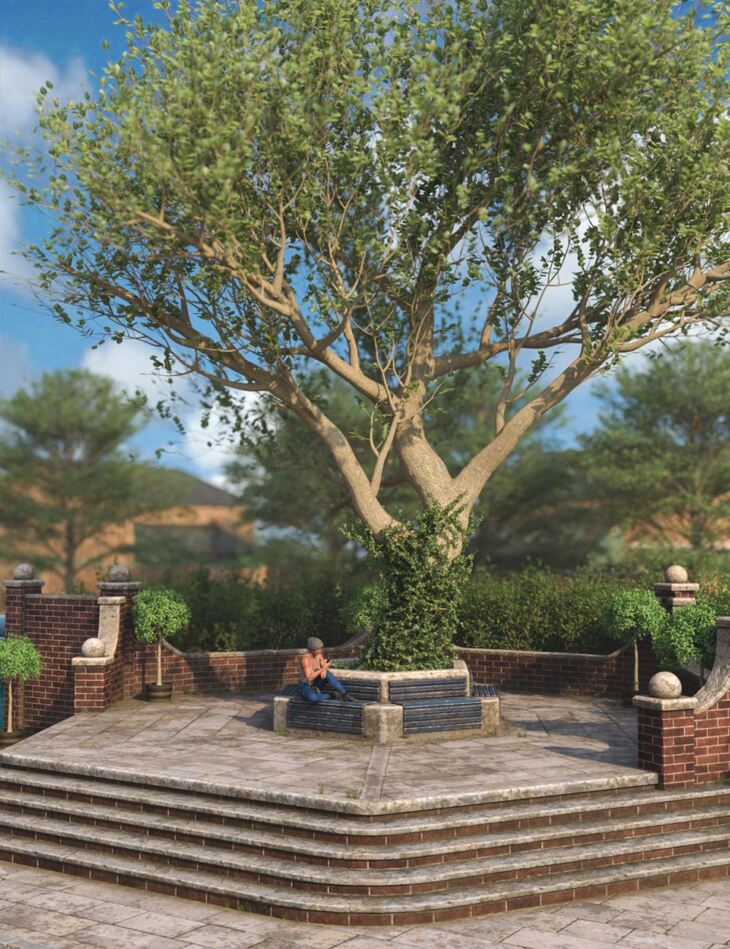 This set includes a leafy tree within the center of a brick-walled enclosure.