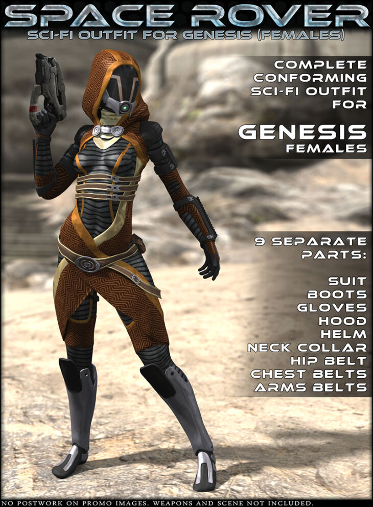 Space Rover is a complete Sci-Fi conforming outfit for Genesis females.
