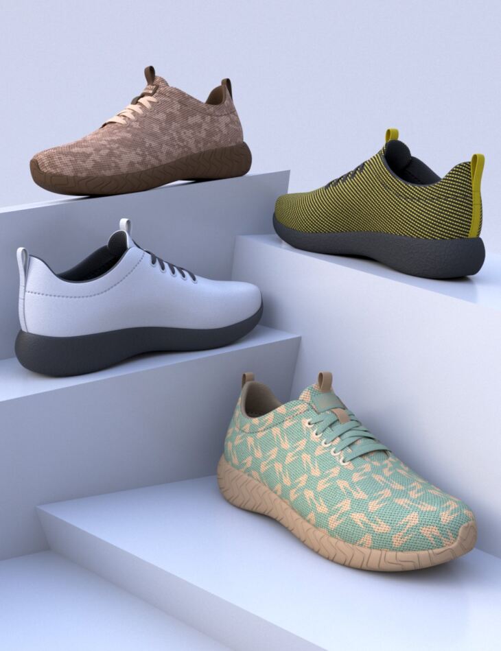 HL Comfort Sneakers for Genesis 8 and 8.1 Females are presented in five variants of the main material, these are leather, Polyester Jersey, Polyester Sport Knit, Spacer Mesh, and Synthetic Twill - in total 18 basic color combinations, as well as three variants of the sole relief in seven colors.