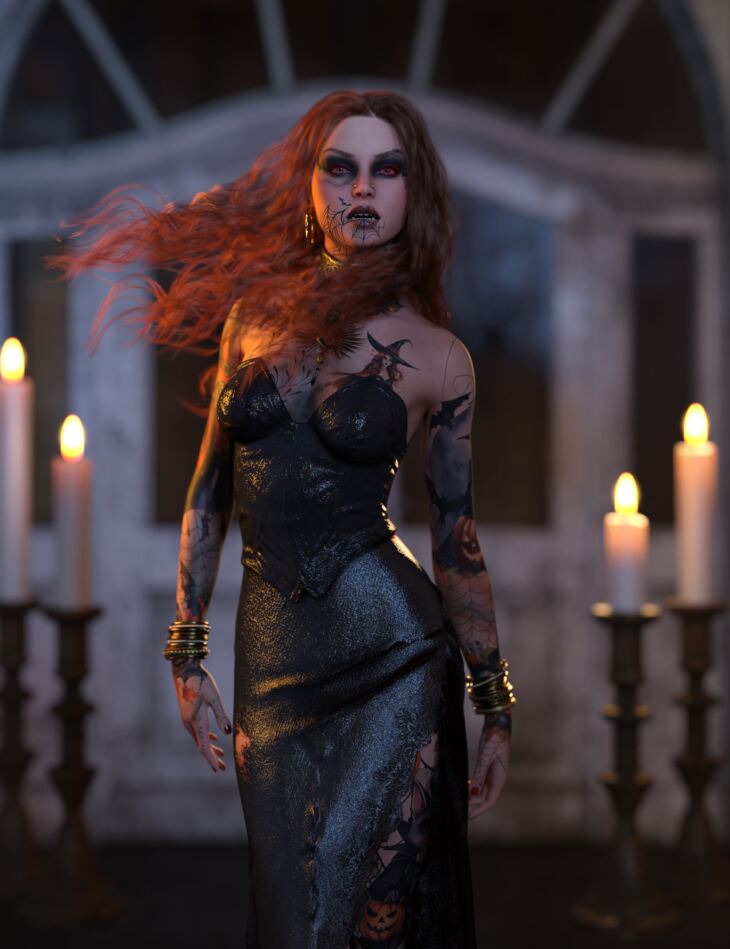 Hallow is a custom character for Genesis 9, She has Realistic textures with eye colors, eyebrows, eyelash colors, lip colors, nail colors, tattoos, and makeup options to change her look.