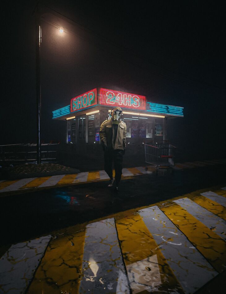 HT Foggy Neon Shop is a moody, cinematic 3D environment for Daz Studio, featuring a small shop glowing with neon lights in the middle of thick fog. The setting evokes mystery, solitude, and a hint of retro-futurism—ideal for dystopian, cyberpunk, or atmospheric urban scenes.