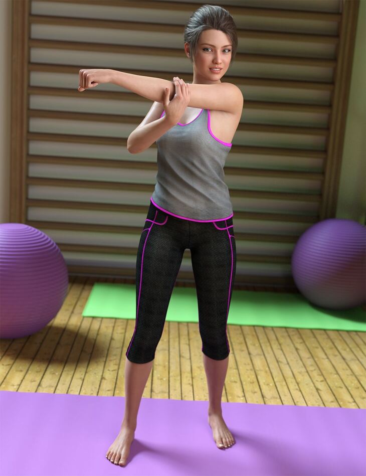 This set includes 25 carefully crafted poses and separates (upper and lower) for Genesis 8 Female that will integrate your characters into authentic exercise and stretching scenes with ease.