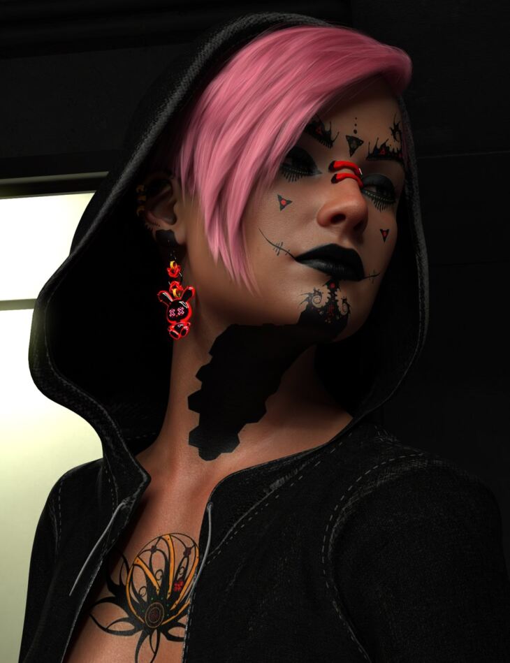 Interlinked 2054 Accessory set for Genesis 8 Females is a super expressive generously contained cyberpunk wearable accessory collection containing visually stimulating and uniquely crafted earrings - featuring ear and nose accents coupled with a range of ear, face, leg and torso tattoos.