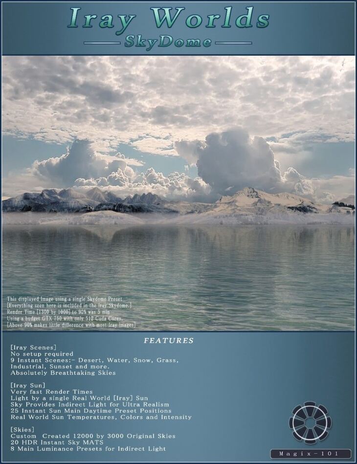 It features a large skydome with UHD skies 12000 x 3000 mirrored at 180%, so 24000 x 3000 for incredible realism, yet they render very fast indeed even on a video card with a low number of Cuda Cores.