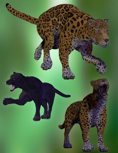 'Jaguar by AM' is a Poser/DAZ 3D model reproducing a Panthera Onca (Jaguar), both in standard fur colours and melanistic variation. Features a hand painted fur texture, 10 morphs and 16 poses to replicate most common Jaguar aspects and behaviors.