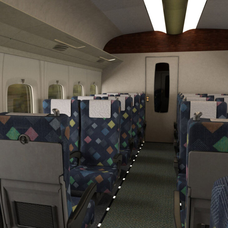 A detailed section of rail car interior based heavily on a modern Japanese shinkansen bullet train.