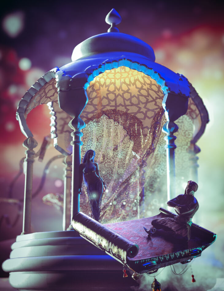 This set comes with a Genie's lamp, a Flying Carpet Hoverboard, and a vignette representing Jasmine's tower. Curtains and veils complete this ensemble.