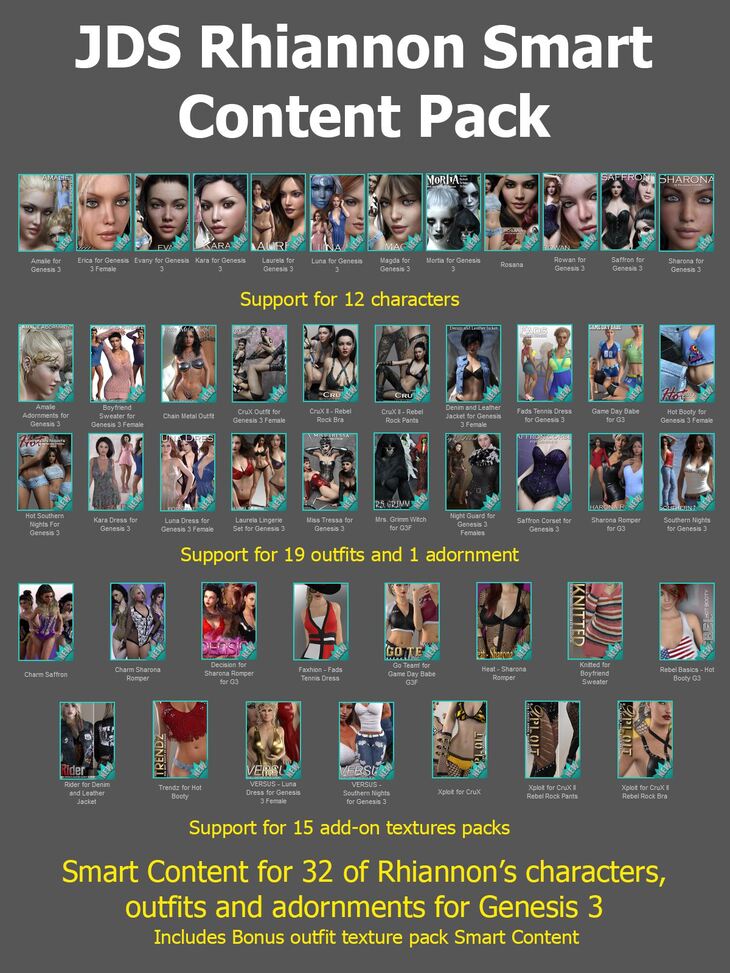This pack contains the required smart content metadata for 32 G3F products produced by Rhiannon, plus 15 Add-On texture packs produced by Sveva, Anagord, crender, P3D-Art, ShanasSoulmate, kaleya & vyktohria.