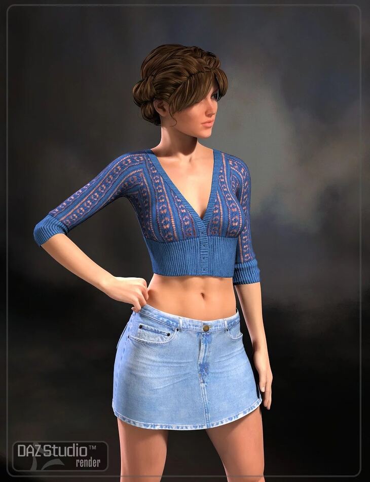 The blouse can be open or pulled together to expose the breasts. The skirt has the pull down and zipper down morphs that you find on the JeanZ for Genesis.