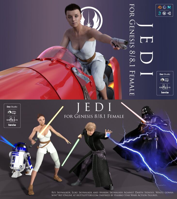 Jedi for Genesis 8 and 8.1 Female comes with Iray material preset and attachments, incl. Genitalia, Genesis 8.1Tears, Eyelashes, Outfit, Boots, Haircut, Lightsaber, a Steam Punk Transport -- a Jakku Speeder in a Hover Mode -- Fottrest, Left Lever speed control, Right Lever movable, Full Throttle option with or without flames at the back, Weapon -- an Inner Rim Blaster, and Accessories, and Attachments -- a Morphing Bag with movable pins for the speeder. Enjoy.