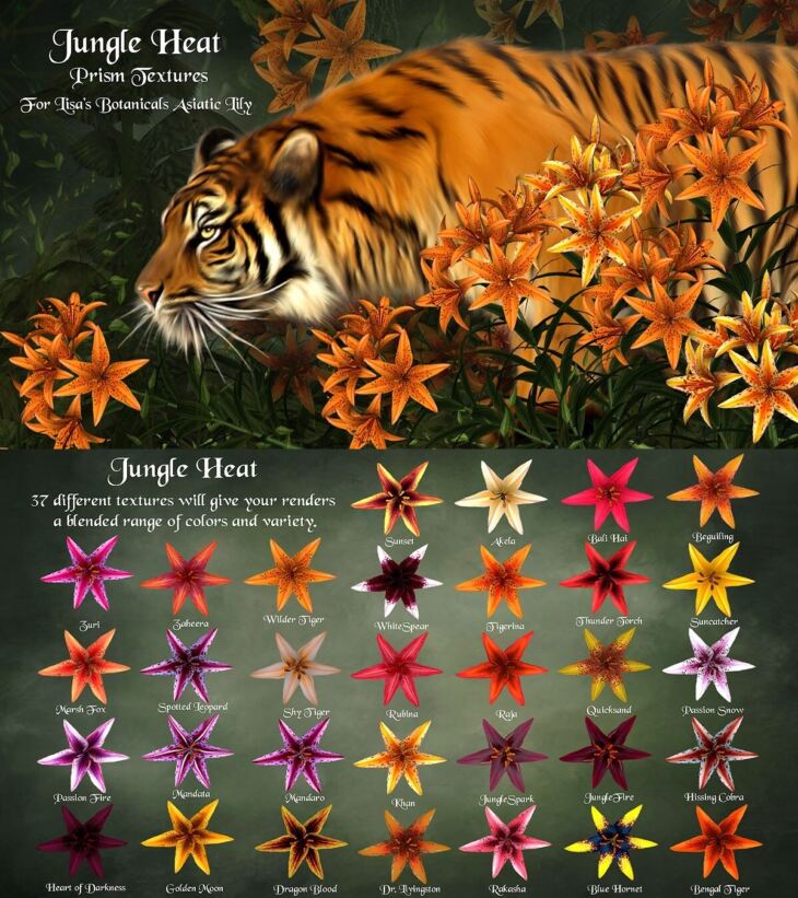 Take your jungle from drab to dramatic with colorful varieties of tiger lilies and exotics, even if your idea of a jungle is only your own backyard! Requires Lisa's Botancials Asiatic Lily. Compatible with Poser & DAZ Studio.