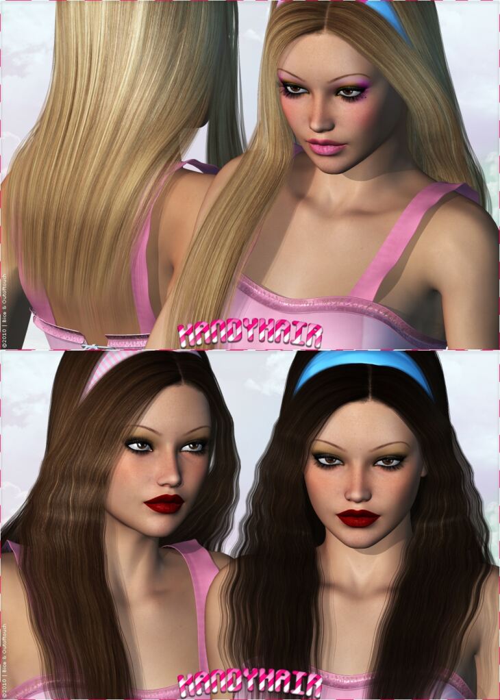 Get the Kandy style with Kandy Hair for Victoria 4, Aiko 4, The Girl 4, Miki 3 and Kids 4. Kandy Hair is a high quality conforming hairstyle with hairband. 46 built-in Morphs give you lots of possibilities for styling, adjusting and special effects! Included are 25 high-res photorealistic texture colors with the option to seperately color strands with "Streaks" and "Mix" matposes.