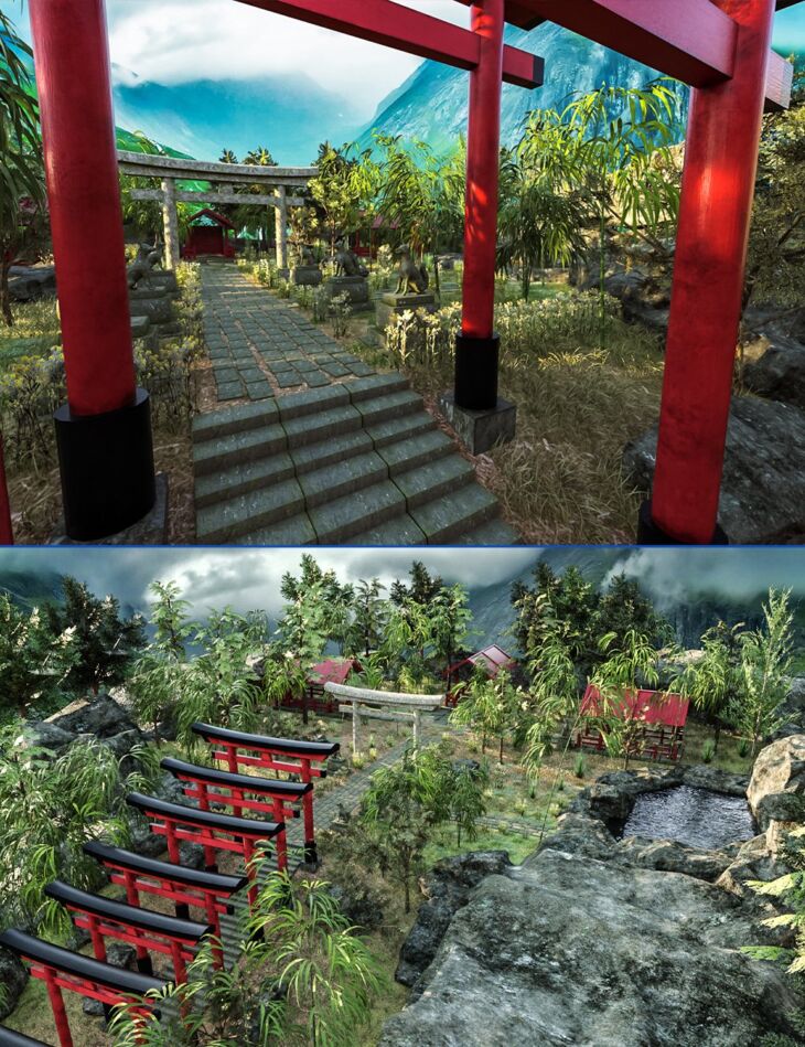 Here we present to you our take on a garden filled with Kitsune statues. People can come in here and visit the place where it is also filled with a lot of torii, a traditional Japanese gate that marks a transition from the mundane to the sacred. Use the Kitsune Garden however you want.