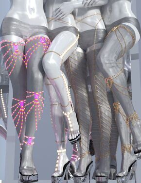 Four sets of leg chains consisting of belt or thigh band (left and right mirrored and can be used together), shin bracelets and anklets (18 pieces per model 36 pieces in total).