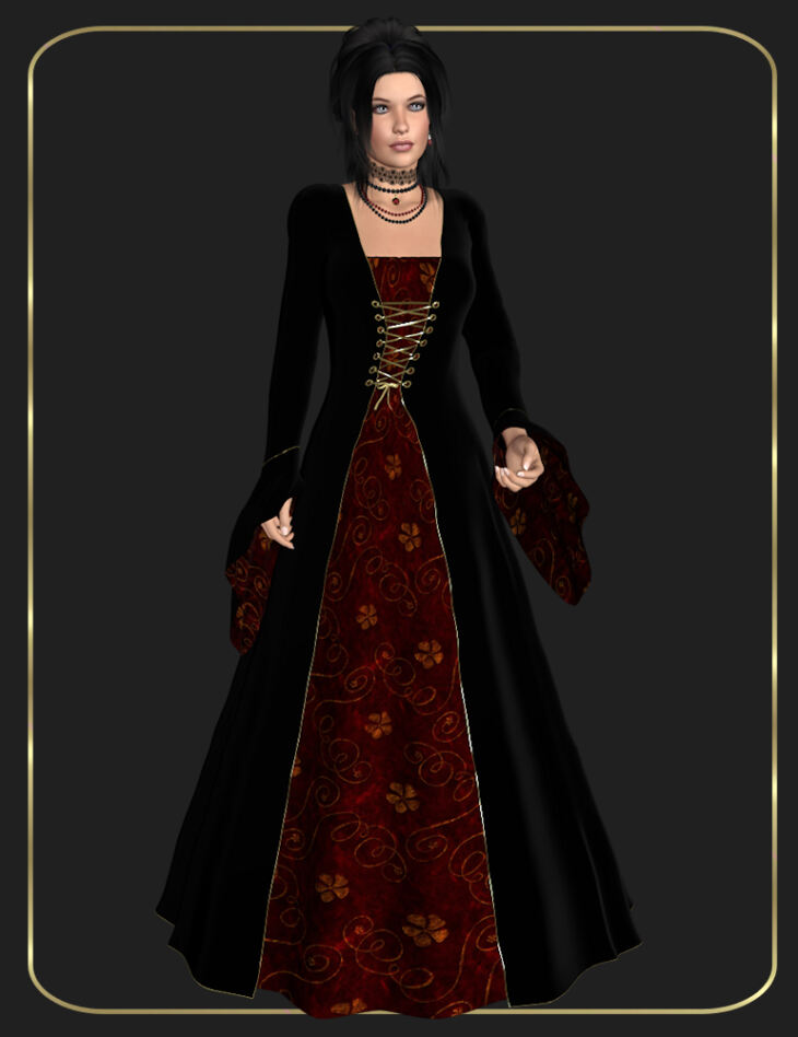 Included are a conforming gown, a conforming overgown with poseable sleeves, and conforming earrings wit poseable pendants. Smart props include a lace choker, a pearl choker with pendant, a string of beads, and a string of pearls.