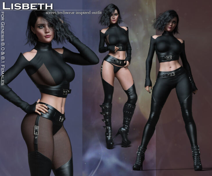 Lisbeth is a new street/techwear inspired outfit for the Genesis 8/8.1 females. Lisbeth includes a pair of pants, a matching top, and a panty, all created with a combination of black leather and mesh.