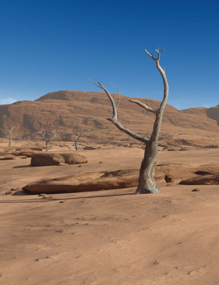 Little Desert Valley is a 360-degree landscape with a central valley terrain covered in sand and surrounded by large and small stones, dead trees, rocky hills, and rock formations.