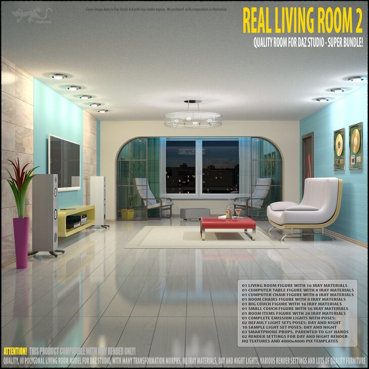 Living Room 2 for Daz Studio - Super quality room with many furniture, materials, morphs, and lights!