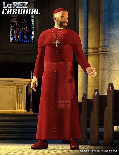 This standalone low resolution Cardinal figure is highly detailed and very easy on resources. It comes in two version one with a Zucchetto skull cap and the other a Biretta square hat. This figure can lend itself to a scene set in the Renaissance period or that of the modern day. Polygon count for both comes in at 6580 and 6644.