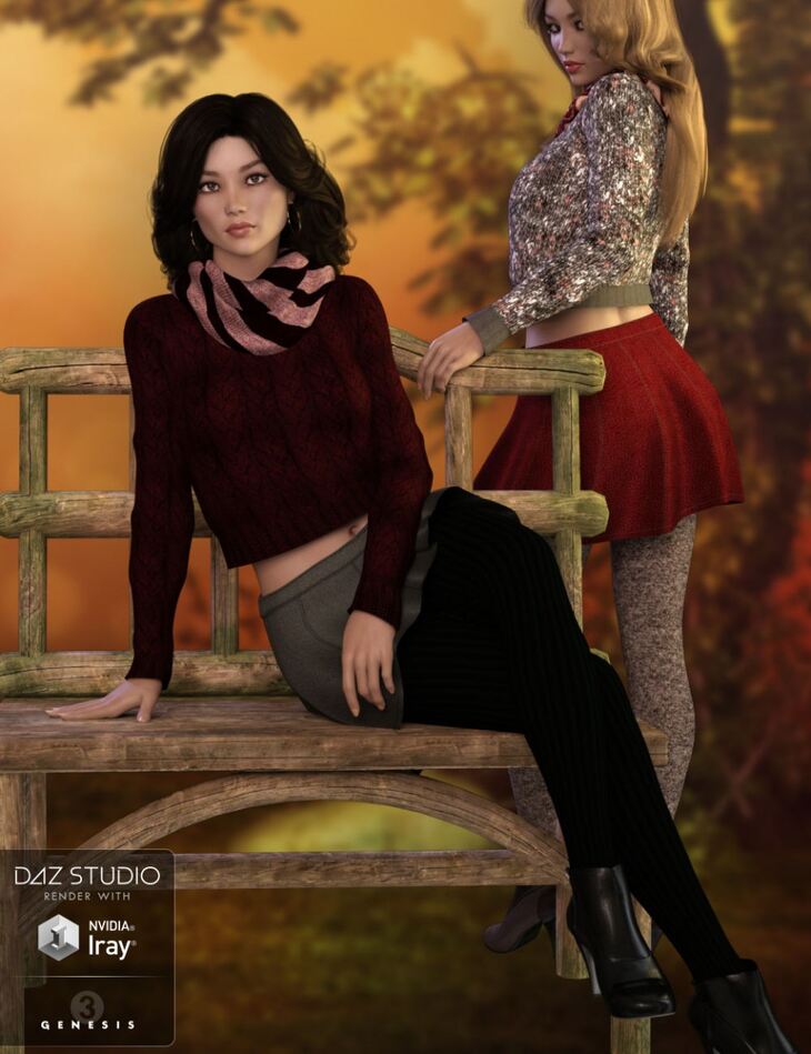 Lorilynn's Style is a fabulous fall outfit, right in style with today's fashions. A skater skirt, cropped sweater, ring scarf, tights, and ankle boots set the tone for the perfect fall/winter outfit. With four fabulous texture sets, your Genesis 3 Female characters are set for the season.