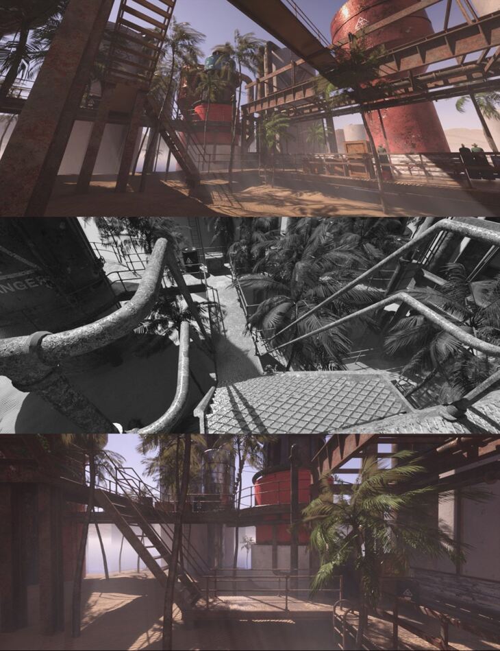 It towers with rusty, grungy, and clunky catwalks, railings, and ladders. Plus lots of crates, vents, cans, barrels, and small details like ivy to complete the look.