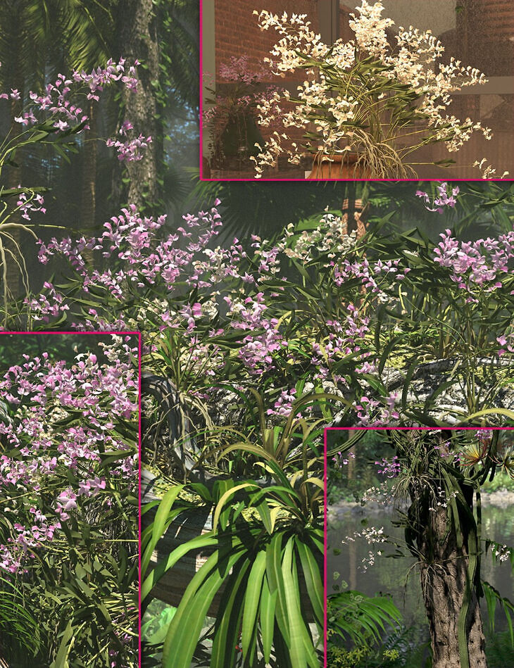 This set of 15 Low poly ( perfect for background and mid to far distance use as well as instancing!) Wild Dendrobium Orchid plants will do the job perfectly, whether its in a plant pot on a surface away from the camera (the rootless ones are great for this (though you could have the roots trailing down the sides of the pots too!) or growing along branches or tree trunks as they do in the wild.