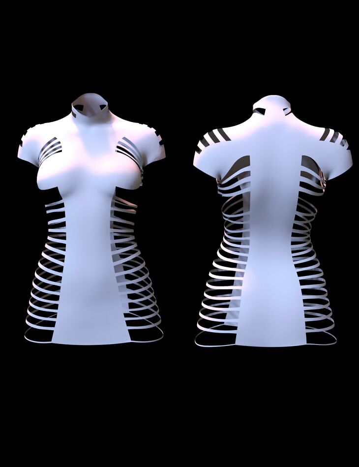 The M3D dForce Blackwire Dress for Genesis 9 is a sleek and daring outfit designed to showcase your character's power and confidence. Inspired by cyberpunk aesthetics and modern body architecture, this short dress combines solid core panels with wire-style side bands that expose and enhance the figure.